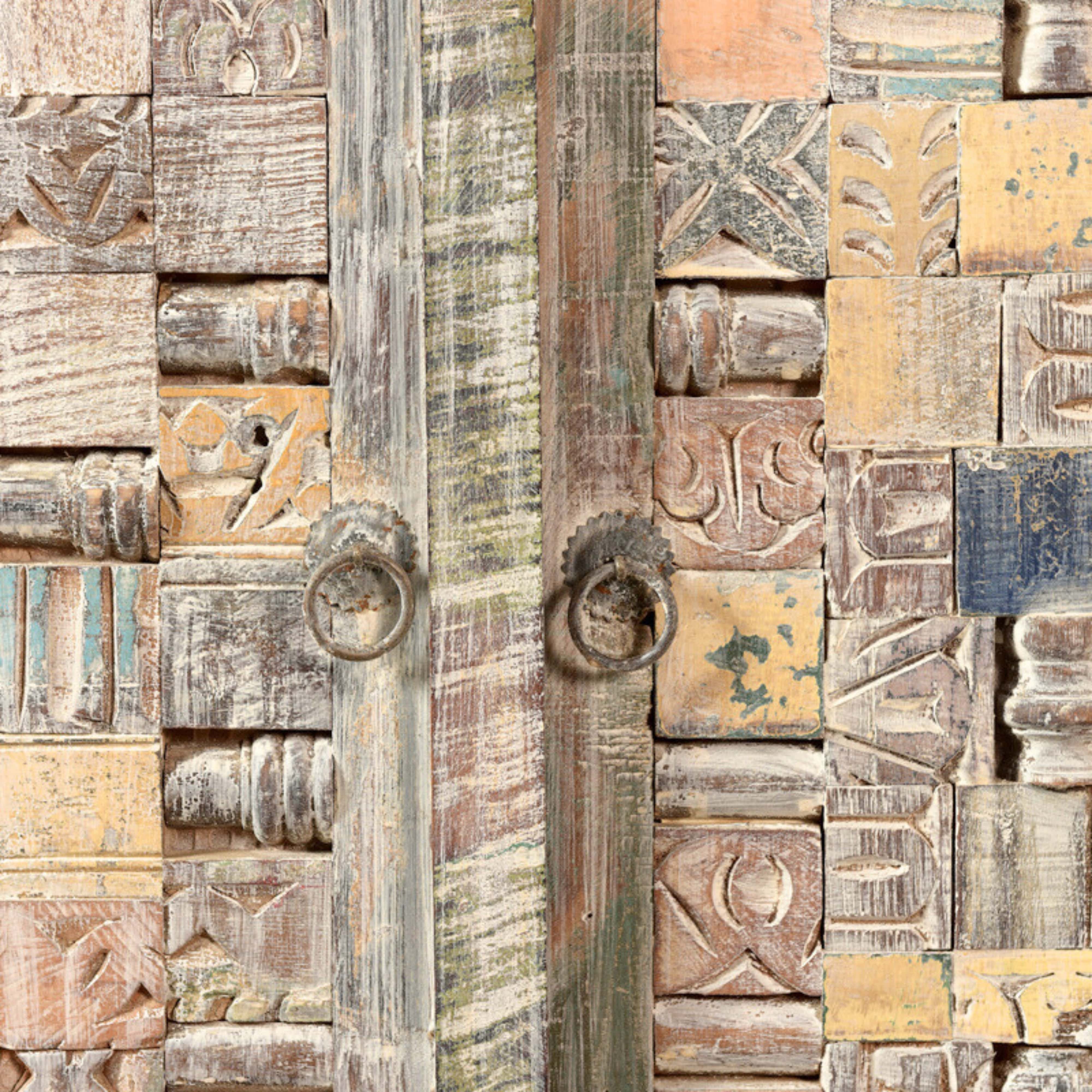 Le buffet bois recyclé ethnique 3 portes LILA est un meuble de rangement robuste de taille compacte, idéal pour un petit séjour ou une entrée. Ce buffet est fabriqué de façon artisanale en bois massif recyclé, ce qui en fait un meuble éco-responsable. En effet, ses façades sont un assemblage d'anciens éléments de maison recyclés, ce qui fait de chaque meuble une pièce unique. Puis le bois utilisé pour la fabrication de la structure du meuble est également recyclé, a été cérusé et blanchi.