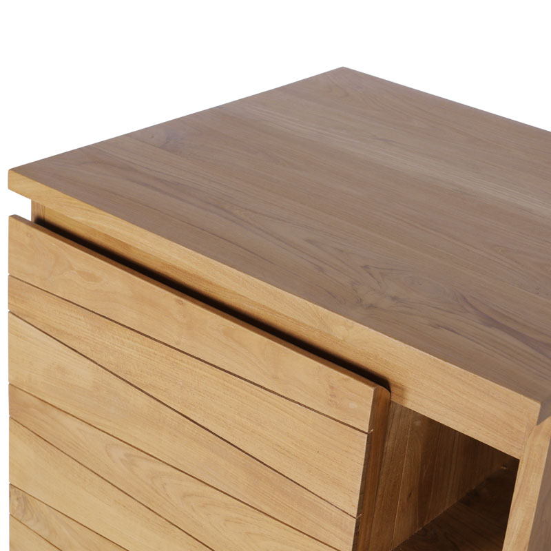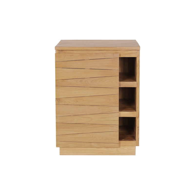 Dimensions meuble vasque : 60 x 55 x h80cm. Finition : vernis transparent imperméabilisant à base d'eau. Matière : structure, pieds et façade en teck massif certifié. Design façade : lames obliques. 1 porte avec charnières à frein. 3 niches latérales de rangement. Meuble de rangement salle de bain livré monté avec un vide de 5 cm à l'arrière pour la tuyauterie.