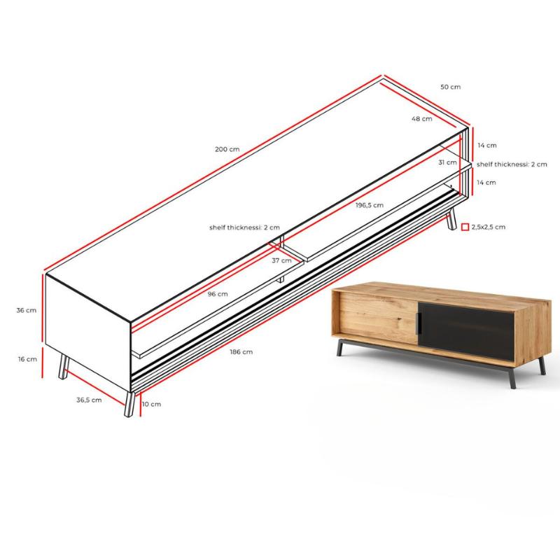 Dimension utile étagère bas : 196,5 x 37 x h14cm.