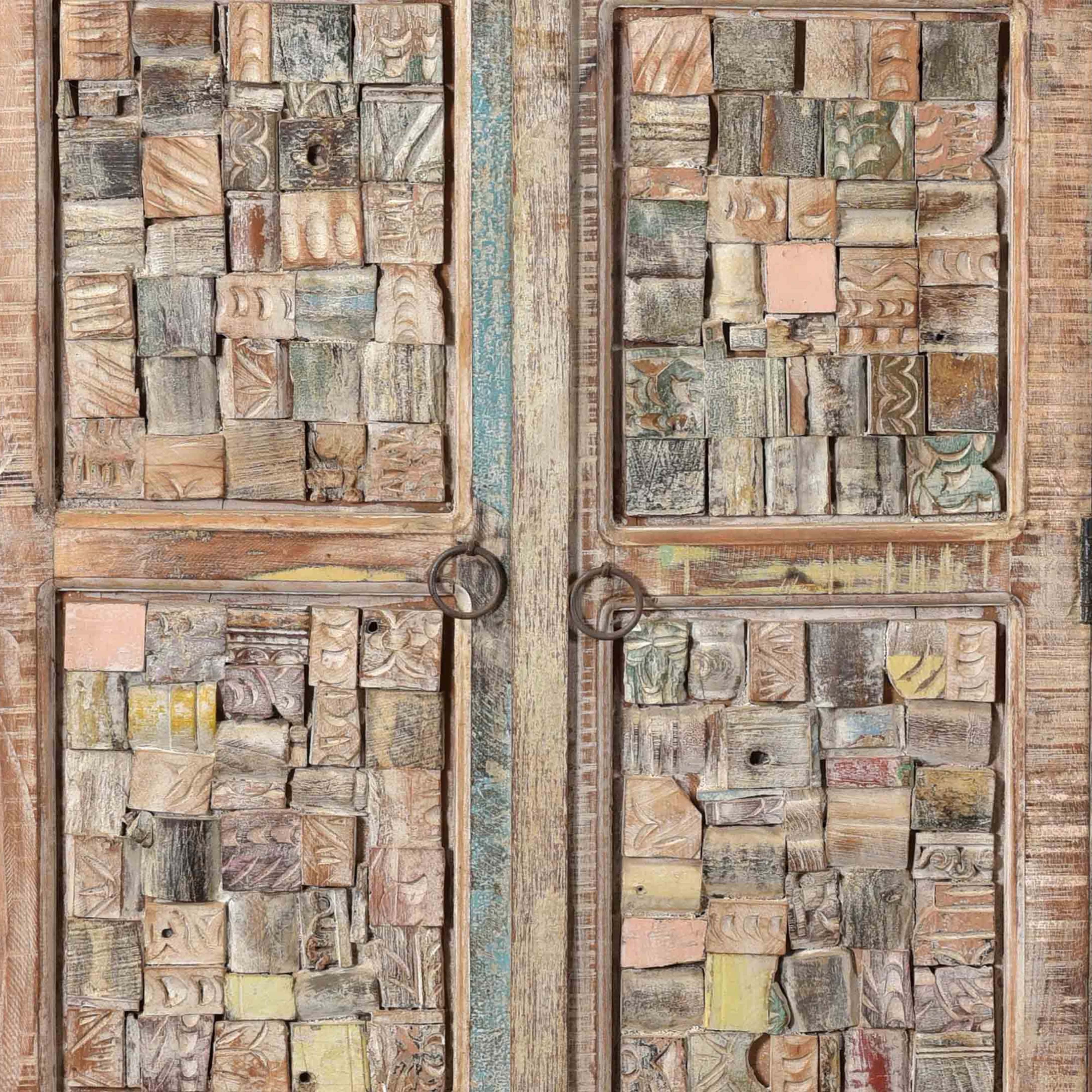 Rangez votre maison avec une touche d’exotisme et de modernité grâce à cette armoire en bois recyclé blanchi et coloré. Vous serez sans aucun doute charmés par le travail effectué sur le bois des façades qui a été récolté sur d’anciennes bâtisses indiennes et retravaillé pour lui offrir une seconde vie. Le bois a été patiné puis ciré pour lui donner un aspect ethnique et imparfait des plus sublimes qui sera idéal pour se démarquer parmi votre décoration. De même l’aspect légèrement vieilli du bois donne à ce meuble une véritable identité unique en son genre !